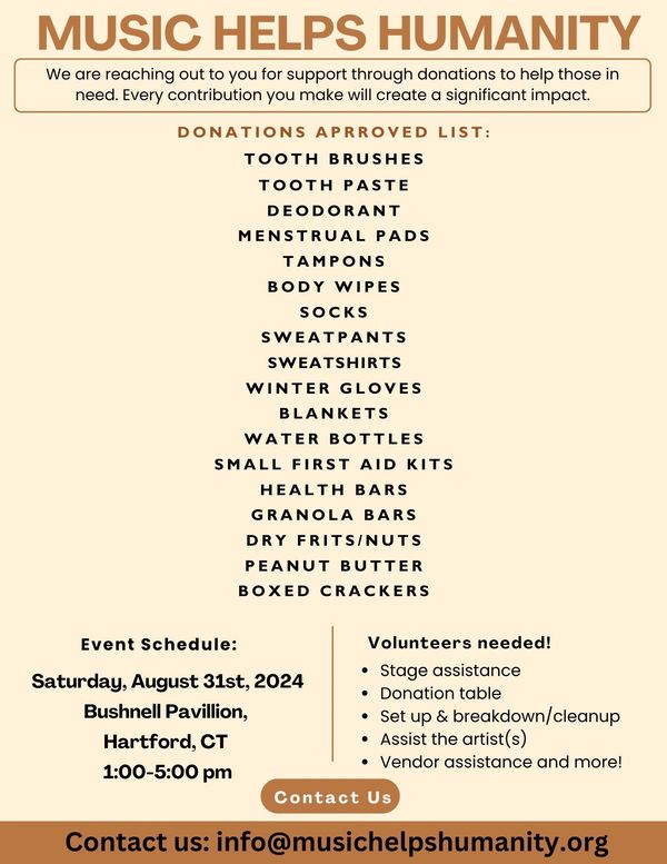 Music Helps Humanity, Inc. is a 501(c)(3) nonprofit organization. Using the universal language of music to uplift & support individuals who are unhoused & facing other challenges within our community. We provide opportunities, & a supportive network for artists,while also preserving the history of music for our future.